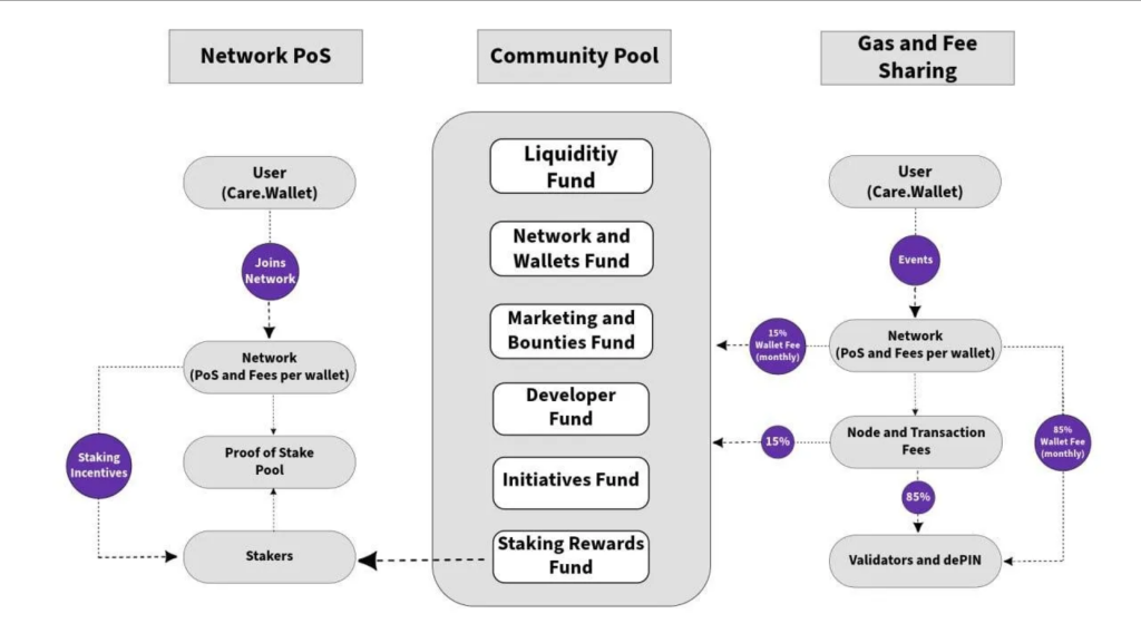 Every Care.Wallet requires decentralized compute and storage in the form of Care.Node. The network sponsor pays monthly node fees per wallet and gas fees per event. Even wallets that don’t transact will generate revenue in the form of node fees. Wallets that are actively transacting will generate additional gas fees. These fees are proposed to be shared by validators, DePIN providers and community pool.
