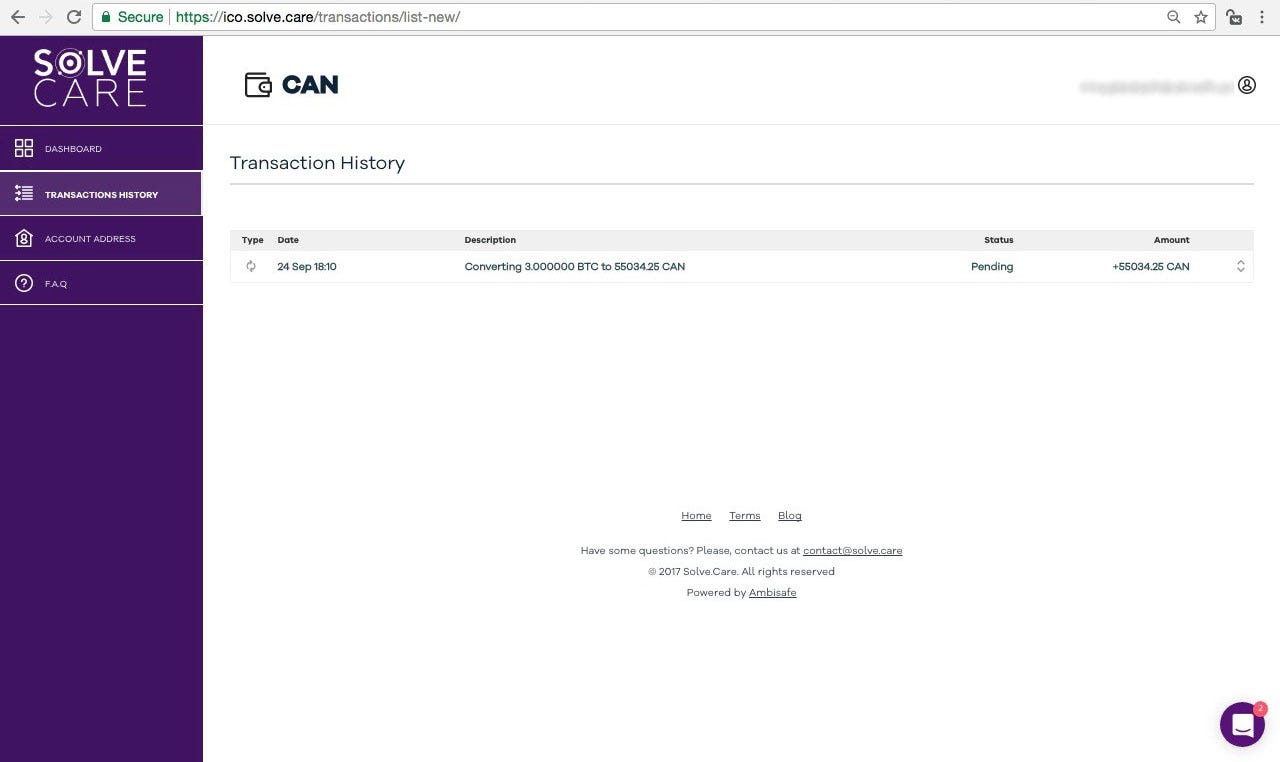 After your payment will be transferred, the status of the transaction will change to Completed, and the amount of CAN tоkеns you bought will appear at the top left corner of your wallet.