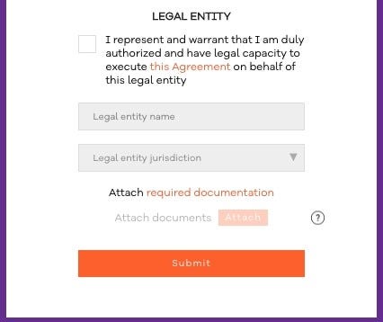 In case you represent a legal entity, please fill in the following section and upload appropriate documentation. If this section is not applicable to you, proceed and press the Submit button.