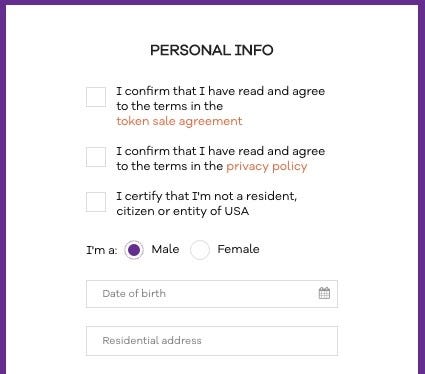First of all, read and confirm that you read the tоkеn sale agreement and privacy policy, and certify that you are not a resident, citizen or entity of USA. Then, enter your date of birth and residential address.