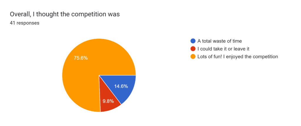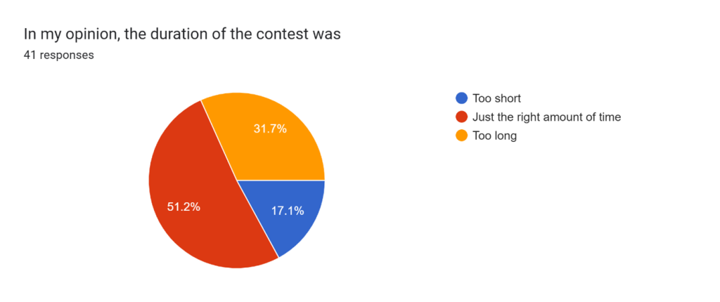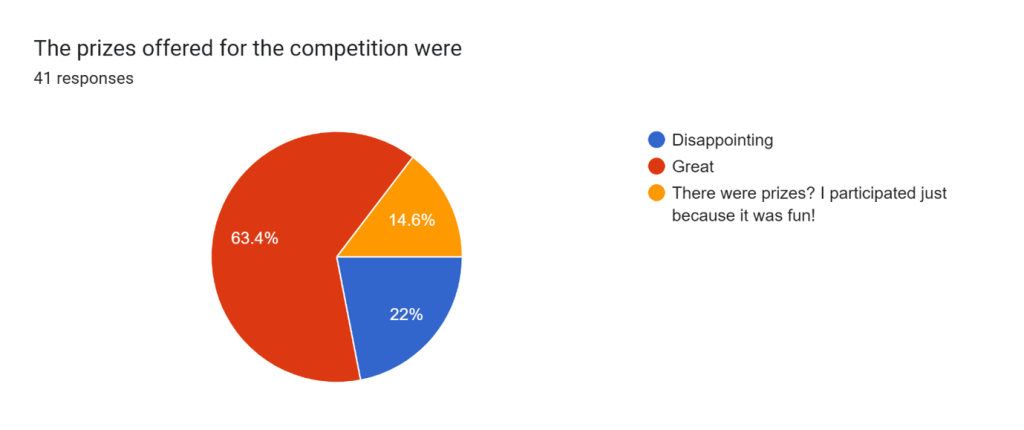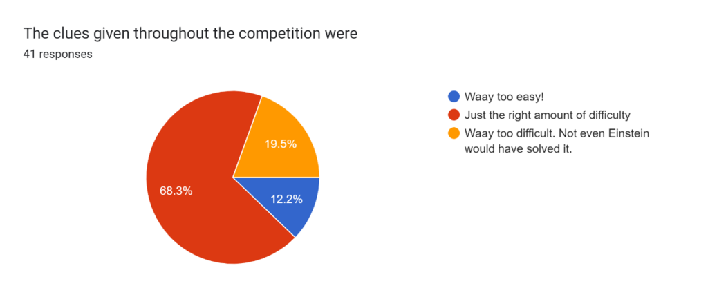 Here we see the majority of respondents thought that the clues given had the right amount of difficulty to solve. We obviously couldn’t make it too easy, else there would not have been any challenge. The 12.2% who thought that the clues were way too easy are obviously the geniuses in our Community! 😊