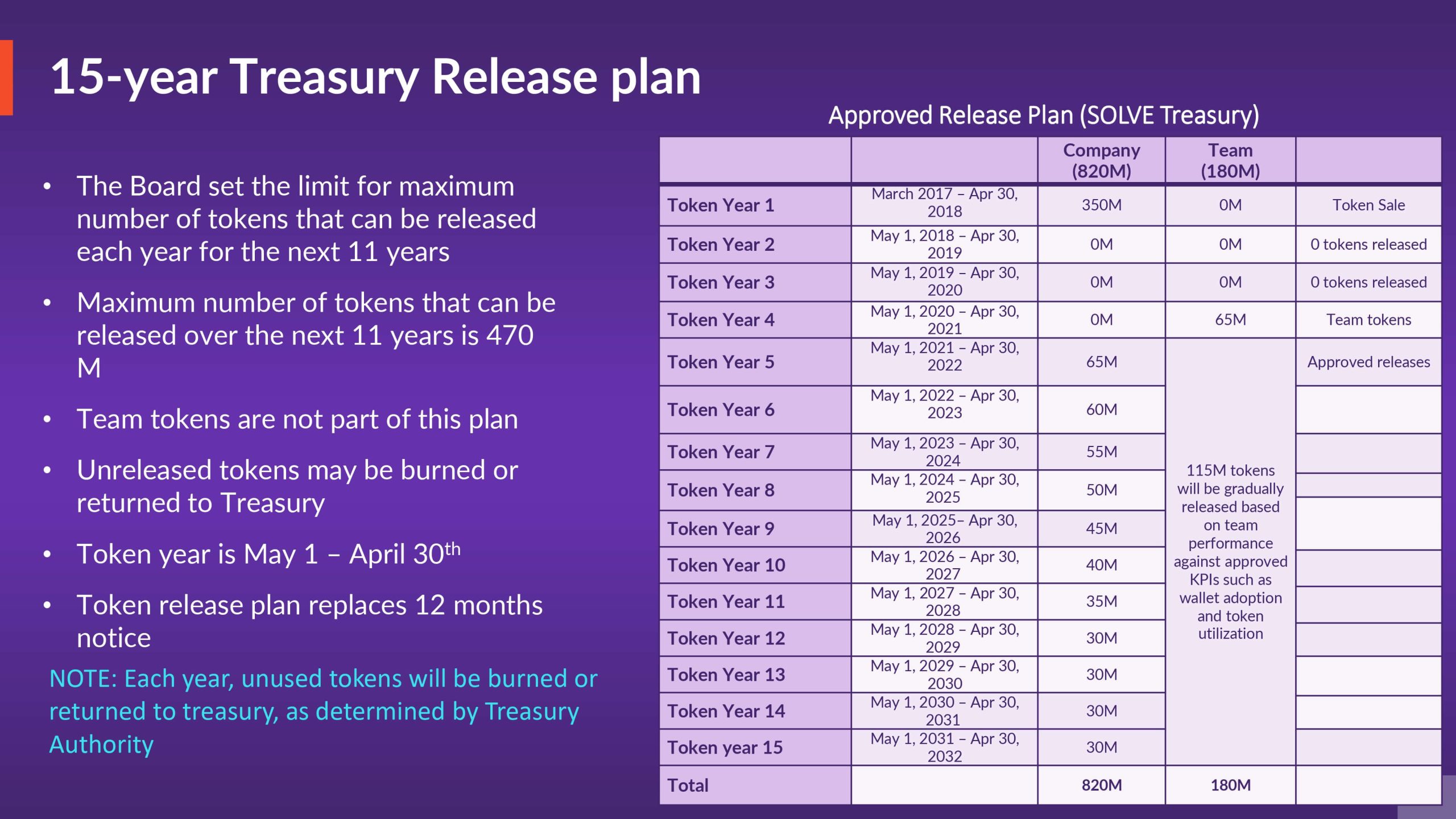 The maximum number of tokens that can be released over the lifetime of the 15-year plan is 470 million, which does not include team tokens. Again, any unused tokens may be burned, used in future periods, or returned to the treasury at the discretion of the authority. The token year runs from May 1st to April 30th, and the new release plan replaces the previous plan of 12 months’ notice.
